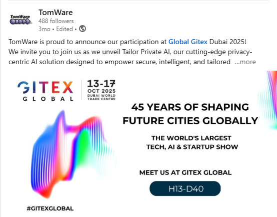 The presence at GITEX Dubai reinforced TomWare’s positioning within the global innovation and technology ecosystem, supporting its long-term international expansion strategy.